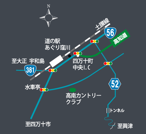 高知自動車道四万十町中央I.Cを下車し、国道56号線を右方向へ。約1km先の県道52号線を右折します。途中信号のある交差点も直進し、峠のトンネルを超え道なりに興津方面へ下りて来ると、興津青少年旅行村の手前にお店の看板がありますので右方向へ入ってください。高速を下車しおよそ20分です。